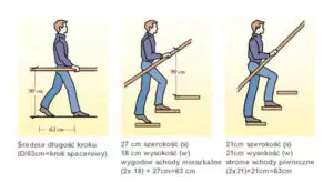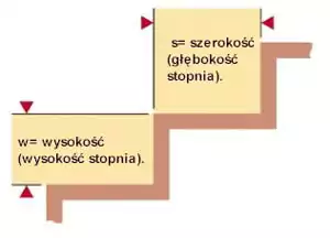 Ustalono, że zmiana wysokości stopnia musi pociągać za sobą odpowiednią zmianę jego szerokości i że wzajemny związek między tymi wielkościami powinien wynosić : 2h + s = 60-65 cm w zależności tej : h – wysokość stopnia [ cm ], s – szerokość stopnia [ cm ].