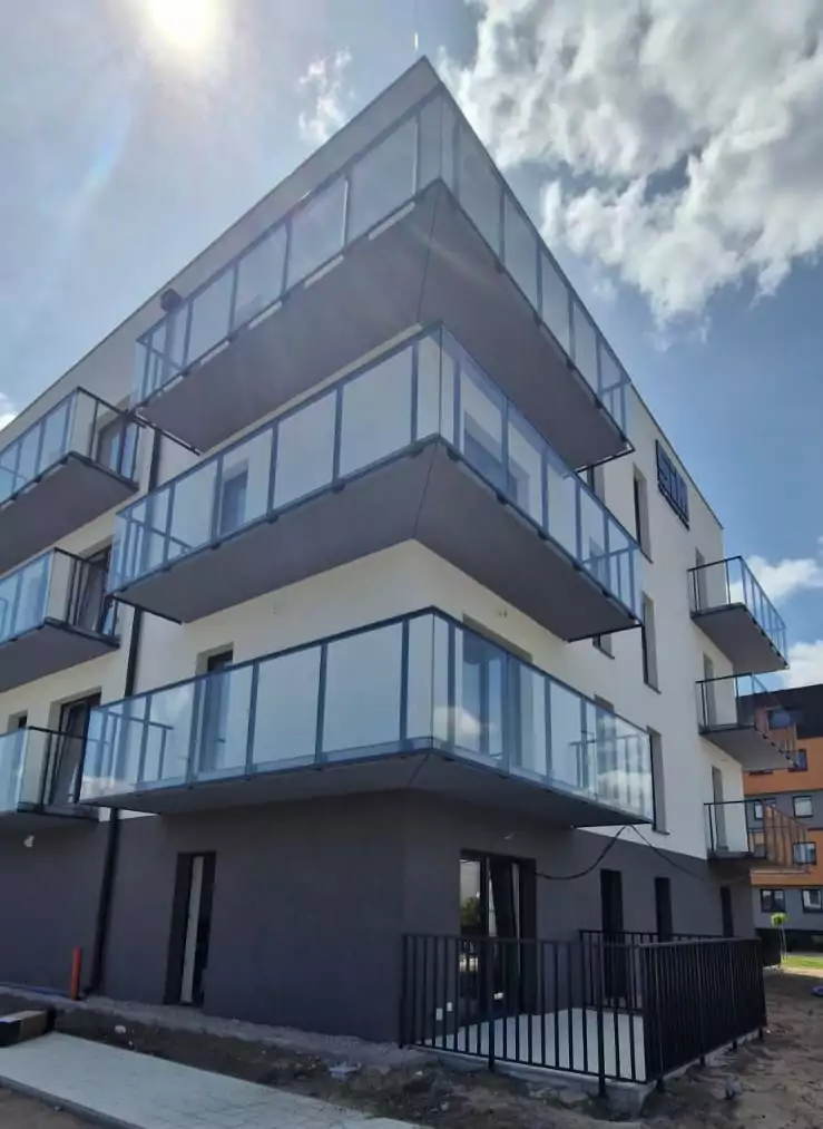 · balustrad aluminiowych malowanych proszkowo wypełnionych szkłem hartowanym bezpiecznym laminowanym z folią przezroczystą na balkonach,