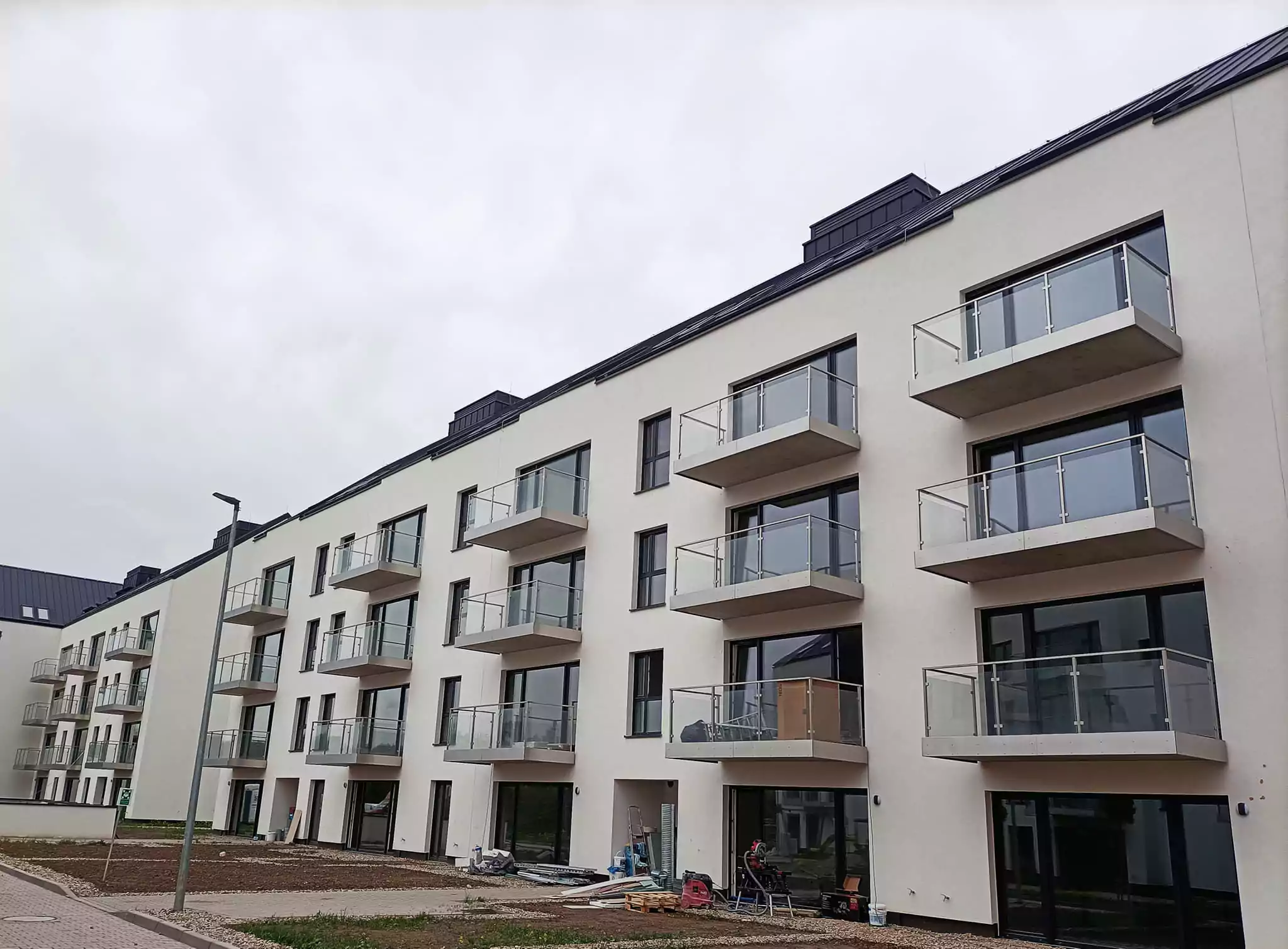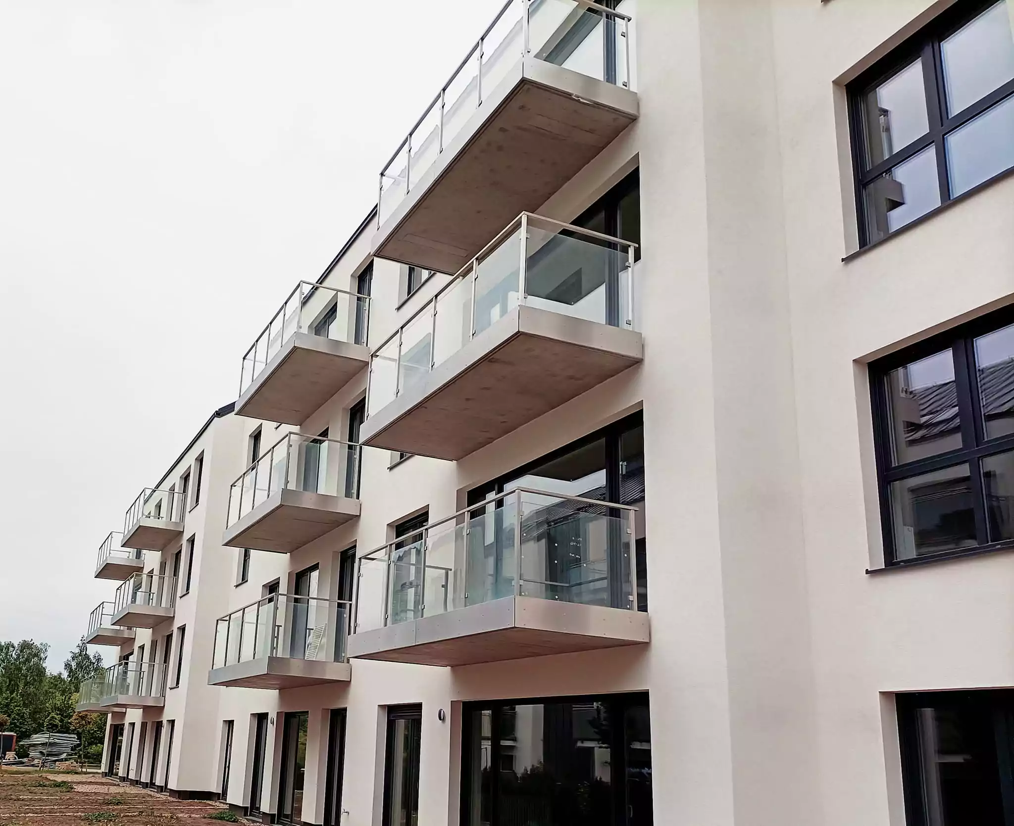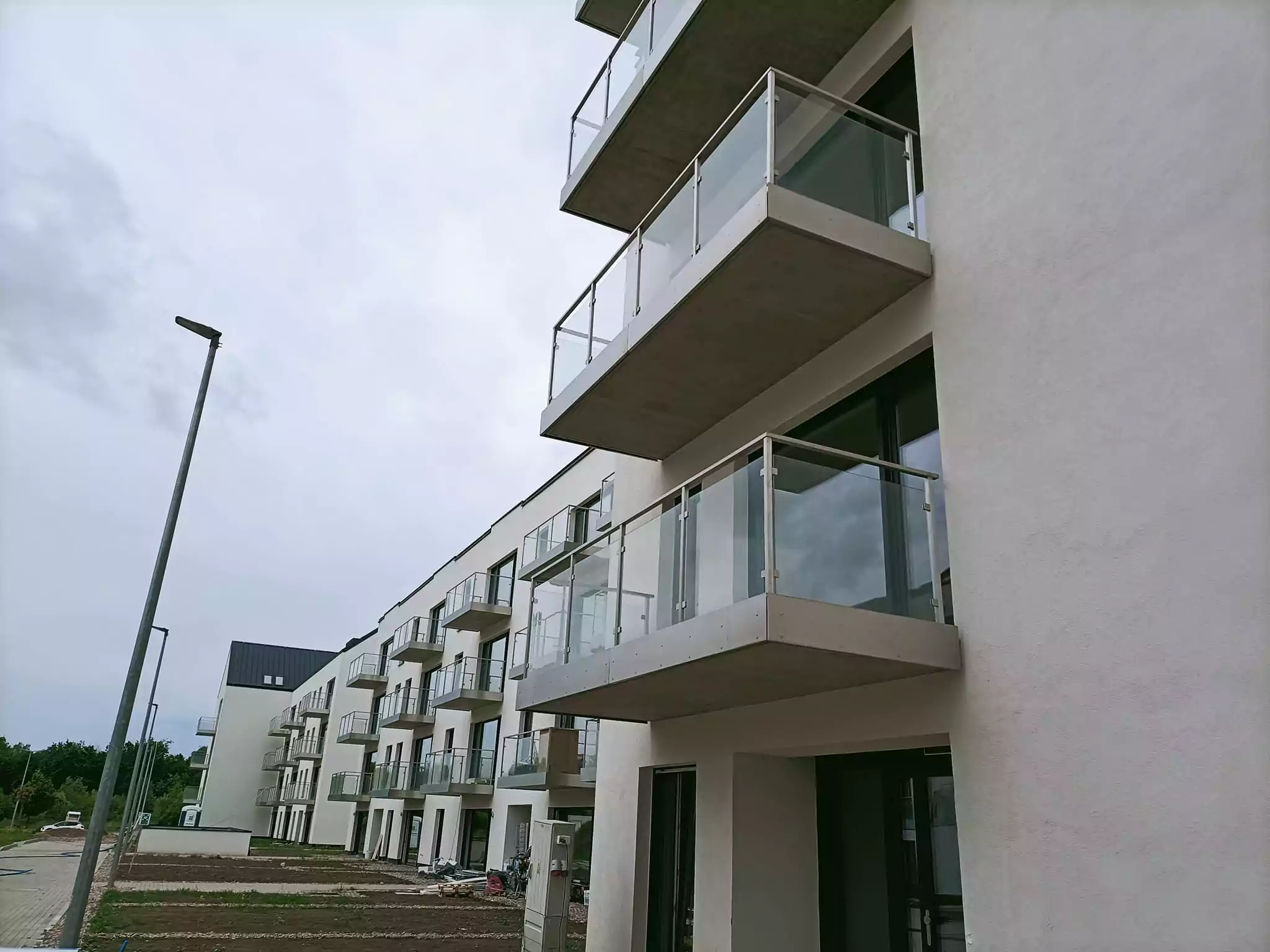 – wykonanie i montaż balustrad zewnętrznych ze stali nierdzewnej z wypełnieniem szkłem bezpiecznym VSG 44.2 plus dodatkowe maskownice ze stali nierdzewnej z blachy szczotkowanej dzięki czemyu nie było konieczności wykańczania czoła balkonów